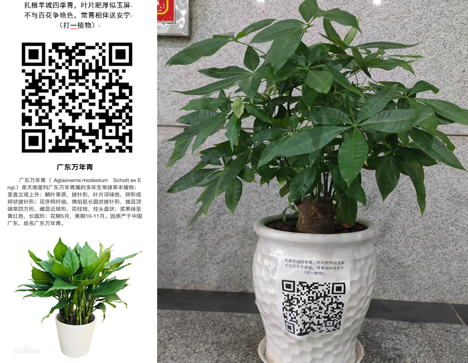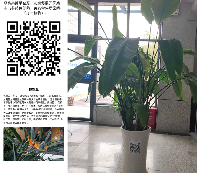 活动精心挑选了馆内常见的广东万年青、绿宝树、鹤望兰等植物作为“谜题载体”。谜语设计兼具知识性与趣味性,既有如“绿箭高挑举金冠,花瓣舒展开屏扇,非鸟非鹤偏似鹤,美名常伴厅堂间”这类通俗易懂的题目,也涵盖植物生长习性、生态价值等科普内容。师生扫描二维码即可查看详细解析,在轻松解谜中学习植物知识,领略文化意趣。