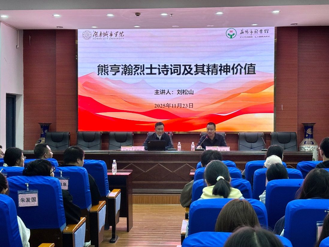 本网讯(通讯员 陈昭君)11月23日上午,由湖南城市学院图书馆与益阳市图书馆联合主办的《熊亨瀚烈士诗词及其精神价值》主题讲座在湖南城市学院土木楼828举行。活动由湖南城市学院图书馆直属党支部书记、馆长莫连光主持,益阳市图书馆馆长胡勇、副馆长张征等出席,与校内师生及读者代表共同聆听这场融合党史教育与文学赏析的精神盛宴。